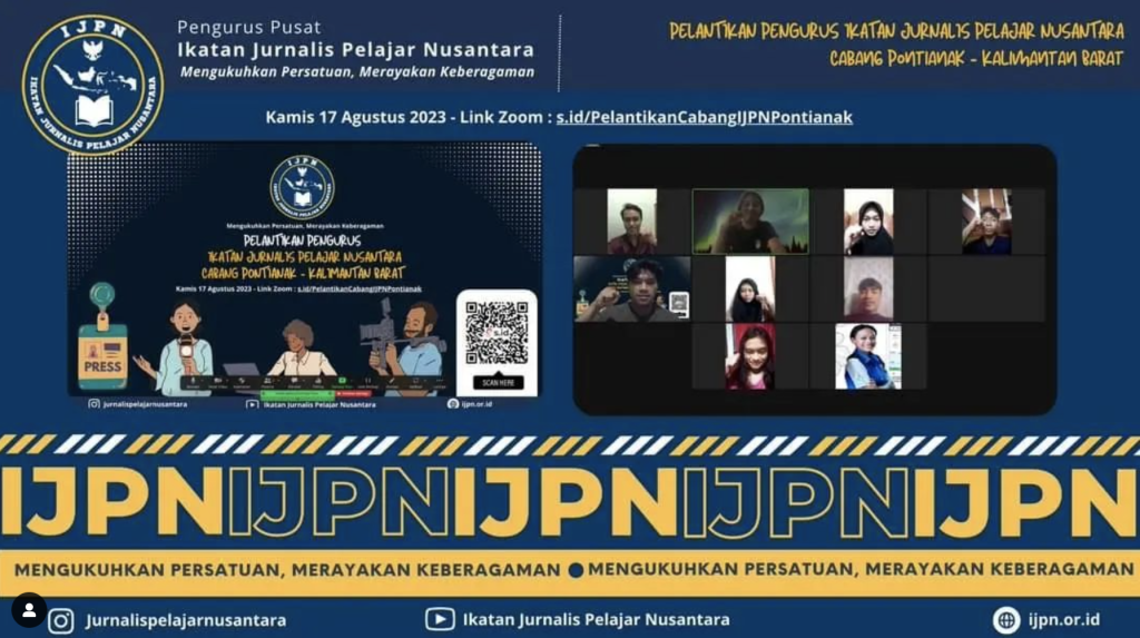PP. IJPN – Bertepatan dengan HUT Republik Indonesia Ke 78 Tahun yang jatuh Pada tanggal 17 Agustus 2023. Penggurus Pusat IJPN (Ikatan Jurnalis Pelajar Nusantara) melantik Pengurus Cabang IJPN di Kota Pontianak secara daring (via zoom).